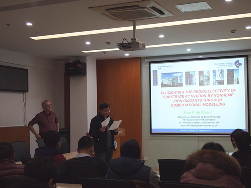 报告中,de Visser教授介绍了他在过渡金属蛋白酶及其非血红素仿生催化剂的构效关系及反应动力学方面的理论研究成果。报告后,de Visser教授参观了部分实验小组并就潜在的合作课题和相关老师进行了交流。