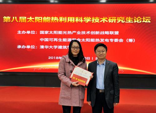 11月29至30日,第八届太阳能热利用科学技术研究生论坛在清华大学召开。中国科学院兰州化学物理研究所在读博士研究生邱晓莉获论坛一等奖,报告题目为: 基于过渡金属硼化物可控构筑高温太阳能吸收涂层及构效关系研究。