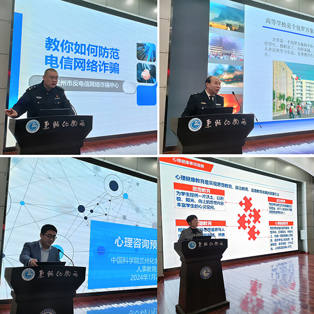 兰州市公安局张晟警官作了题为“反电信诈骗”的报告,讲解了电信诈骗的危害、特点、手段和应对之术。兰州政安防火知识宣传中心宋海兵教官作了题为“消防安全培训”的报告,通过真实的案例讲解了实验室安全规范和防火自救方法。人事教育处相关人员讲解了心理健康预约渠道和注意事项。