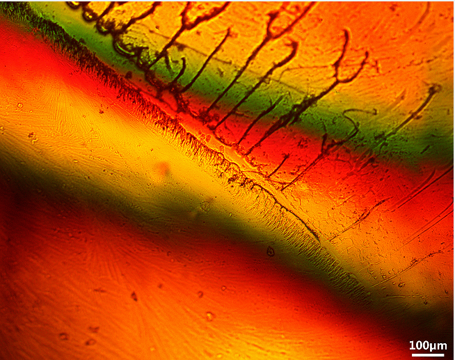 结晶性水凝胶,具有高度有序的分子结构,属于双折射材料。具有双折射性的材料与线性偏振光相结合(在偏振光显微镜下观察),可以实现两束不同光线的干涉,从而产生色彩效果。拍摄过程中发现,样品中混有杂质的区域更具欣赏性,也保留了原图,并简单渲染。大面积的橙色和红色与“秋”最契合。一方面是“秋意浓庆丰收”的热烈,另一方面是“秋叶落万物枯”的萧条。