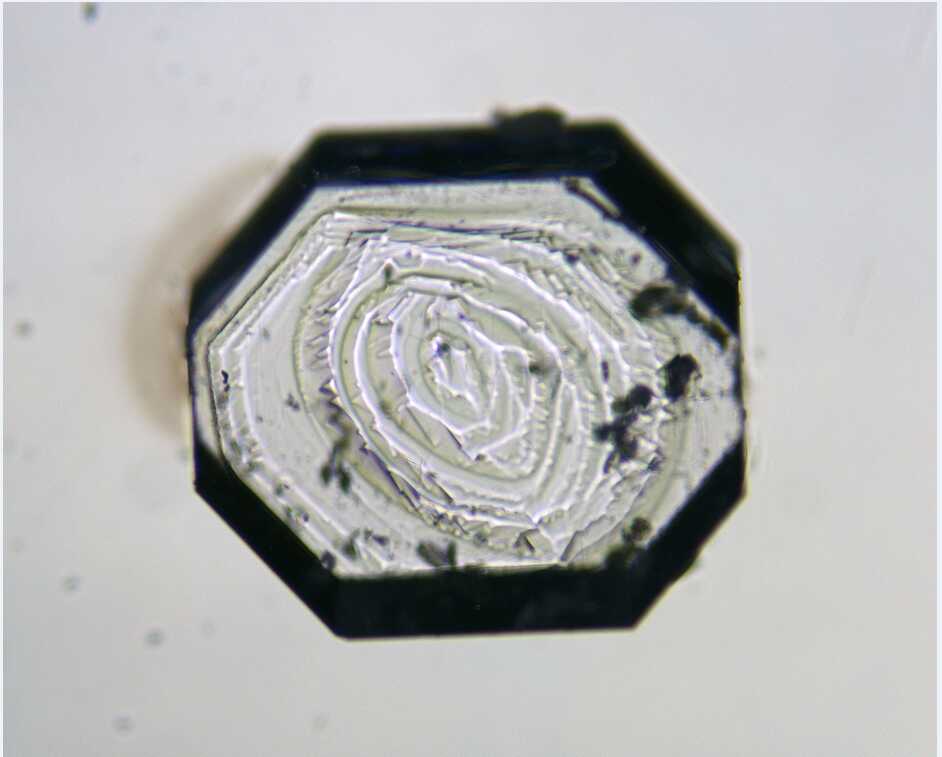 这张图片是光学显微镜下的晶体图,显示了一个透明的八边形结构,中心部分呈现出复杂的层状纹理和同心圆形状的设计。晶体的边缘清晰而锐利,背景是白色的,上面散布着一些小的颗粒或尘埃。整体上,这个物体给人一种精致、复杂且具有高度对称性的感觉。这个晶体的独特构造和它所散发的光芒,让人联想到时间的深邃与神秘,因此,将其命名为“时光之眼”。这个名字不仅捕捉了晶体中心如同瞳孔般的同心圆设计,也象征着它作为自然界中的一员,见证了时间的流转和历史的沉淀。