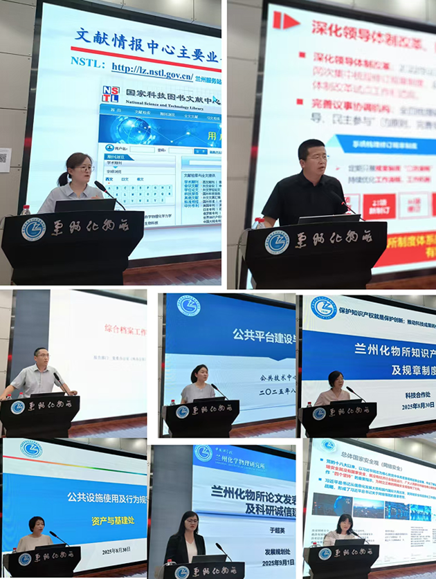 此次教育培训分为业务培训和专题培训,业务培训主要由党委办公室(所办公室)、发展规划处、科技合作处、科技基础能力处、人事人才处、财务处、资产与基建处等分别就党建、档案管理、论文发表与科研诚信要求、民口纵向科研项目及资金内部管理、知识产权管理、网络安全、公共平台建设与运维、人事人才、财务制度与报销管理流程、固定资产管理与政府采购、公共设施使用与行为规范等方面进行了介绍。专题培训主要包括实验室安全教育、防电信诈骗教育、保密教育、质量管理体系及标准化文件管理流程、文献资源及文献情报分析、科研信息素质教育等。