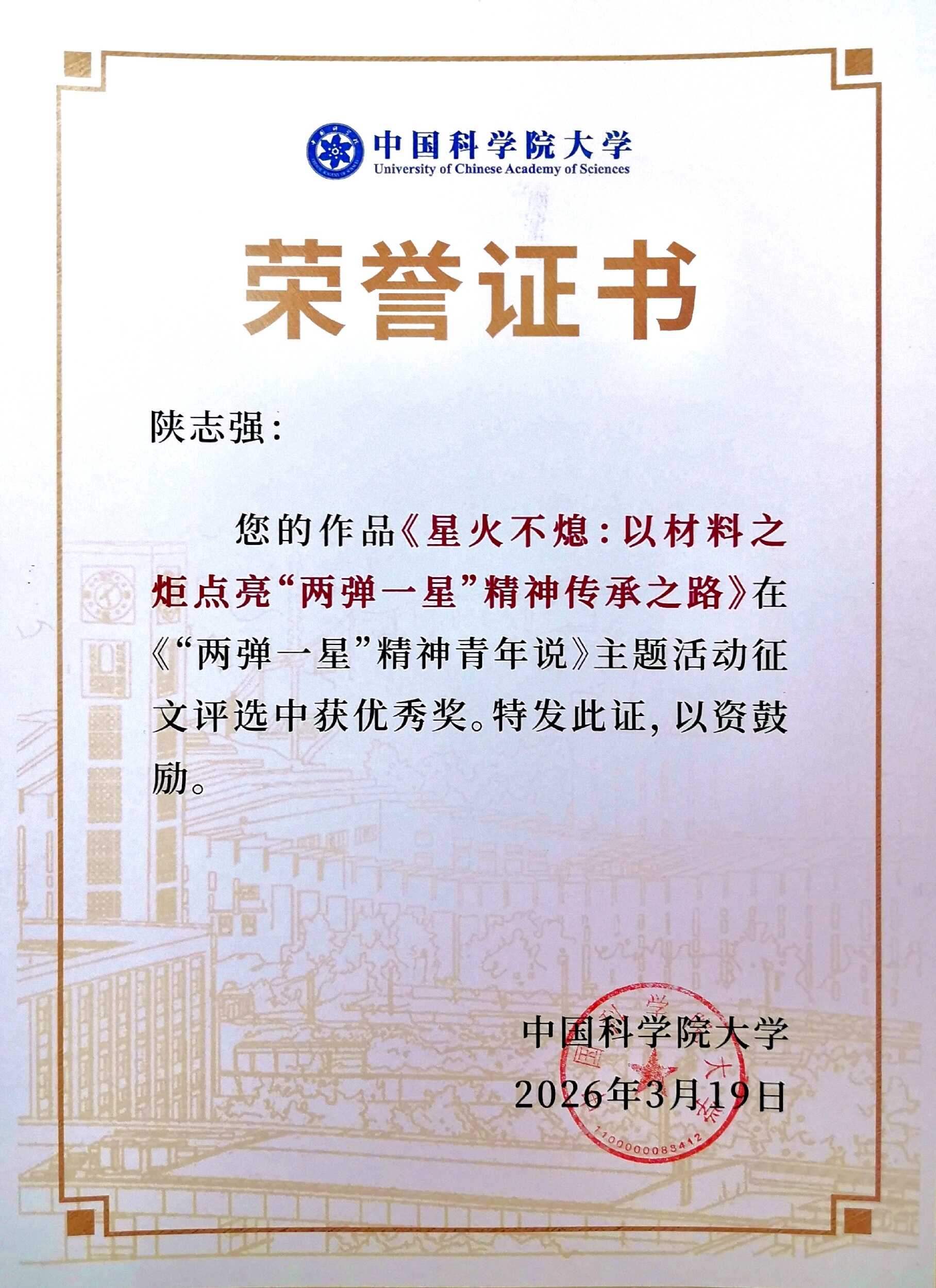 为深入贯彻落实党的二十大精神,大力弘扬“两弹一星”精神和科学家精神,中国科学院大学于2025年3月至11月举办了《“两弹一星”精神青年说》主题征文活动。中国科学院兰州化学物理研究所陕志强博士提交的作品《星火不熄:以材料之炬点亮“两弹一星”精神传承之路》获得优秀奖。