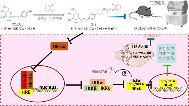 研究团队聚焦高原脑水肿防治重大问题,以高原特色中草药红景天中的活性成分红景天苷为结构基础,基于骨架跃迁和分子杂合的药物设计策略,通过引入邻氟苯基HIF-1α抑制剂药效团,对红景天苷的糖苷键、连接链、芳环取代基等三个部分进行结构修饰,设计并合成了多种红景天苷衍生物开展构效关系研究。通过双荧光素酶报告基因、细胞毒、ELISA等实验,筛选获得强活性化合物N41,可显著抑制HIF-1α HRE转录(IC50: 2.02 ± 0.76 μM),减少C8-D1A细胞炎症因子IL-6和NO的表达以及ROS积累,减轻氧化损伤且无明显细胞毒性。HACE小鼠模型研究发现,N41可有效降低HACE模型小鼠脑含水量,改善缺氧导致的脑组织损伤,通过阻断HIF-1α/IKKα/NF-κB信号通路,抑制下游TNF-α、IL-6等炎症因子及MMP-9、AQP-4等血脑屏障通透性相关因子表达,缓解炎症反应和维持血脑屏障完整性,发挥高原脑水肿防治功效。相关研究成果发表在European Journal of Medicinal Chemistry(2025,297: 117982)上。
