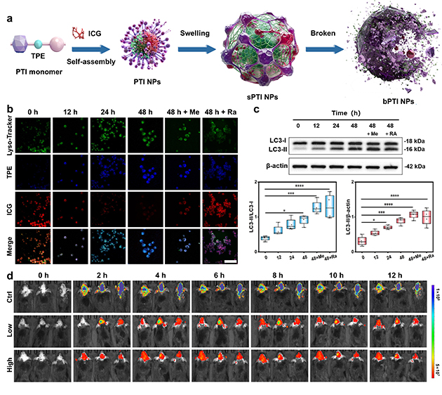 团队进一步探索溶酶体功能变化与Aβ蛋白相分离之间的关系。通过ATRP合成pH响应骨架,将AIE染料四苯乙烯(TPE)共价接枝,并自组装包载近红外ACQ染料吲哚菁绿(ICG),形成AIE/ACQ协同的比率成像纳米结构探针(PTI),实现AD自噬溶酶体酸化缺陷及其驱动的相分离过程的可视化“全流程”监测。