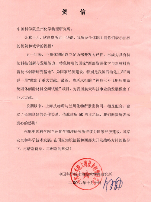 中科院上海技术物理研究所贺信